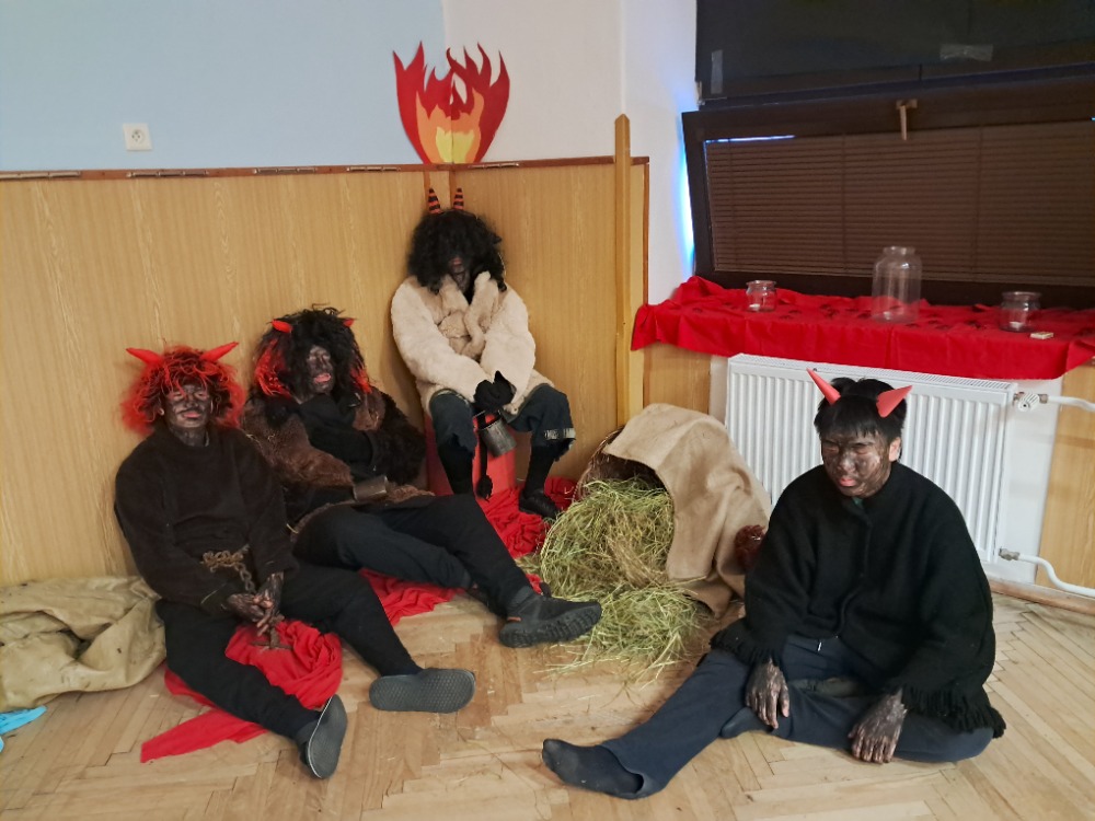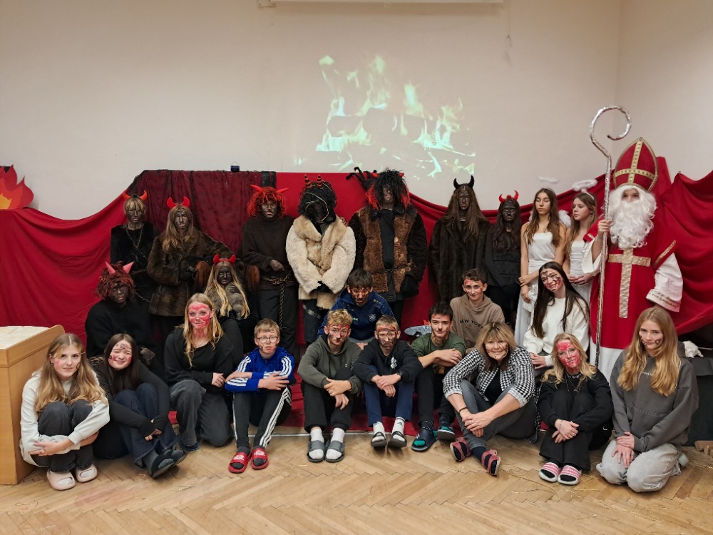 Dnes 5. 12. 2025 se 9. třída na naší škole proměnila v peklo a druhá její část zase v nebe. Jednotlivé třídy byly zvány a celé kolektivy plnily úkoly, aby hříšníkům v jednotlivých třídách bylo odpuštěno. Mnozí se snažili a vzájemně spolupracovali, protože dobře víme, že každý z nás občas také něco „vyvede“, ale největší umění je přijít, problém napravit, umět se omluvit a hlavně se z chyb poučit. Každá třída měla jiný úkol (skládání obrázků, hledání pekelných uhlíků, skákání v pytli ve slalomu, přehrát čerty v kostkách, dostat se po čertovských kamenech z nebe do pekla apod.) Všechny třídy byly na konci odměněny andělskými dobrotami a my pevně doufáme, že se všichni hluboce zamysleli a budou si celý rok pamatovat, co čertům slíbili…