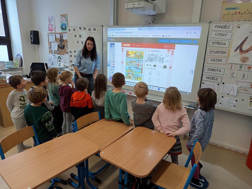 Předškoláci k nám minulý týden zavítali na návštěvu a Mimoň, ochránce a rošťák našich prvňáčků, je s úsměvem provedl třídou i celým dobrodružstvím. Společně jsme se představili, prošli si lanovou ,,cestu do školky“ a objevovali pohádkové kartičky, které Mimoň schoval po celé třídě. Děti pracovaly i na interaktivní tabuli, kde je Mimoň provedl prvními krůčky školáka – od hledání stínů až po hledání slov v obrázku. Na závěr jsme se srdečně rozloučili a už teď se těšíme na další setkání – 17. prosince – tentokrát v tělocvičně.