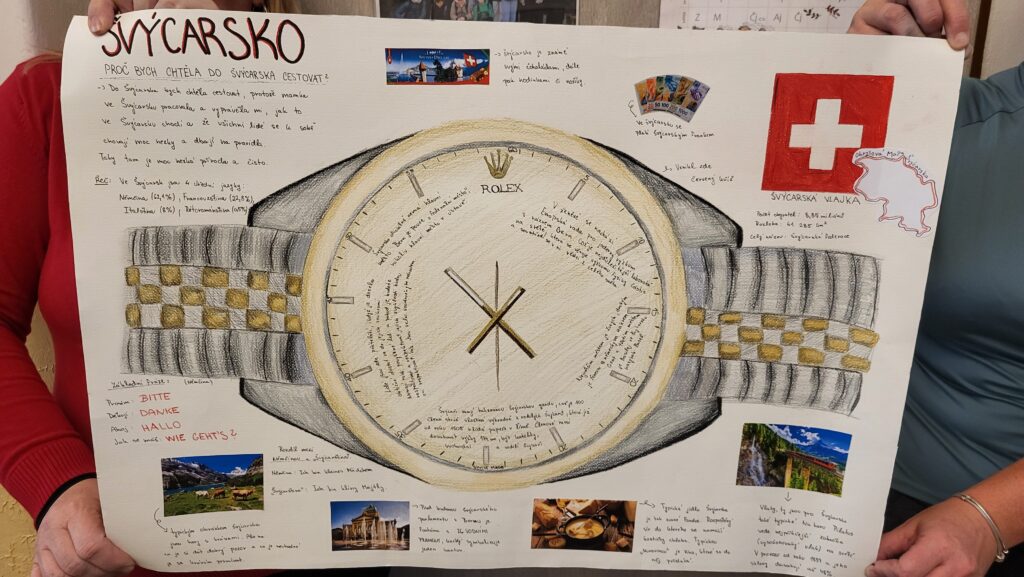 V 10.30hod. jsme se všichni jako obvykle sešli na prostřední chodbě školy, abychom si navzájem představili svou vysněnou zemi v Evropě. A naše „virtuální“ cestování mohlo začít. Průvodkyněmi řady prezentací jednotlivých zemí byly Mirka a Anička z 9.třídy, které „cestovaly“ ze Švýcarska a Maroka a pak si sdělovaly své dojmy z cest na letišti Václava Havla v Praze. Potom děvčata vyzvala ke sdílení svých projektů ostatní žáky. Každý měl za úkol říci, proč si danou zemi vybral, co ho na ní zajímá, co ho tam láká, která místa, přírodní či jiná, památky apod. by tam rád navštívil. Dozvěděli jsme se také např., jaké aktivity by tam rád podnikl a hlavně některé důležité fráze v jazyce, kterým se v dané zemi mluví – např. pozdravy, různé konverzační obraty, zajímavá slova, ale došlo i na písně.