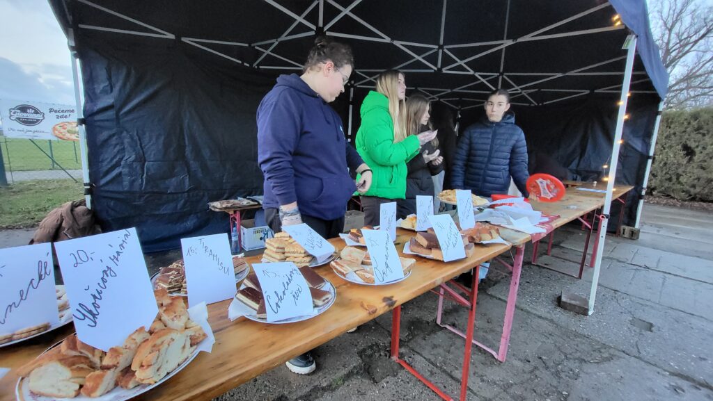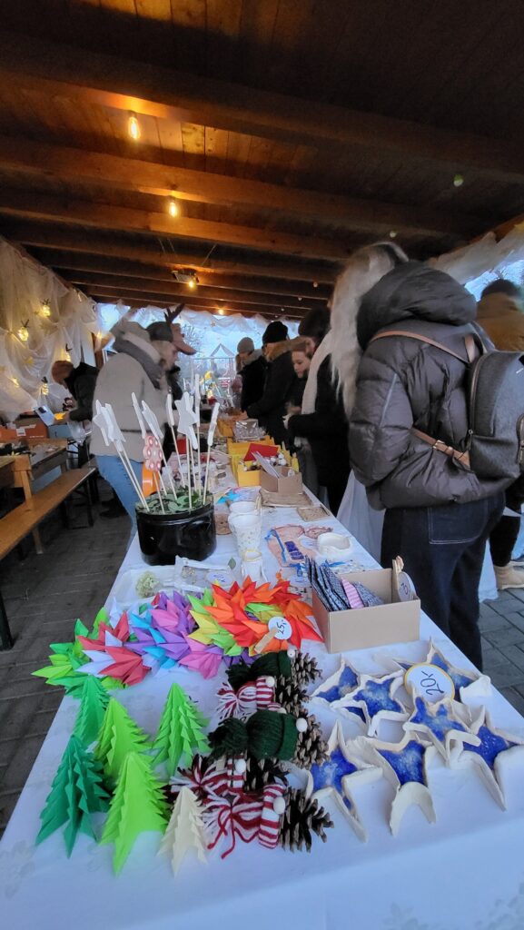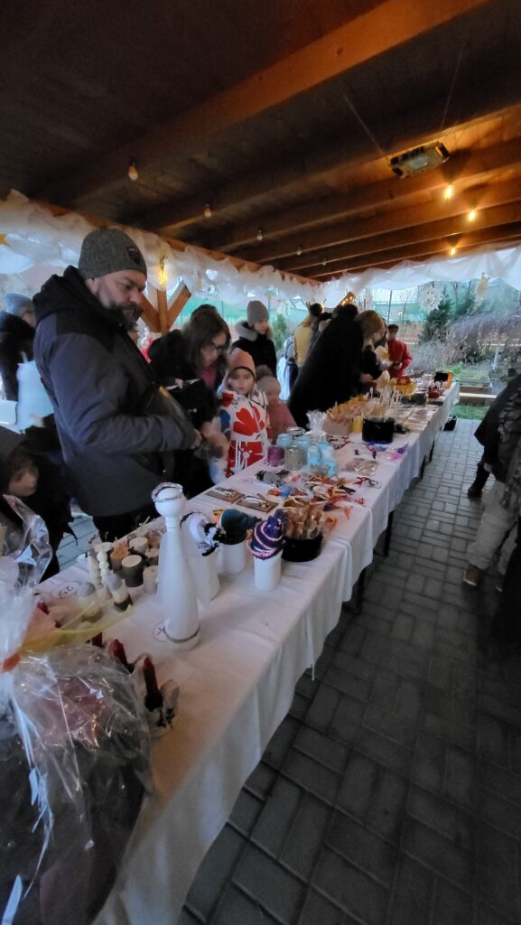 Součástí akce byl také fotokoutek, kde si každý mohl odnést vánoční snímek na památku. V našem „obchoďáčku“ bylo možné zakoupit drobné dárky, nechybělo ani občerstvení s chutnými zákusky a teplými nápoji. Celou atmosféru dotvářela vánoční hudba a všudypřítomná světýlka, která dodala akci kouzelný nádech.